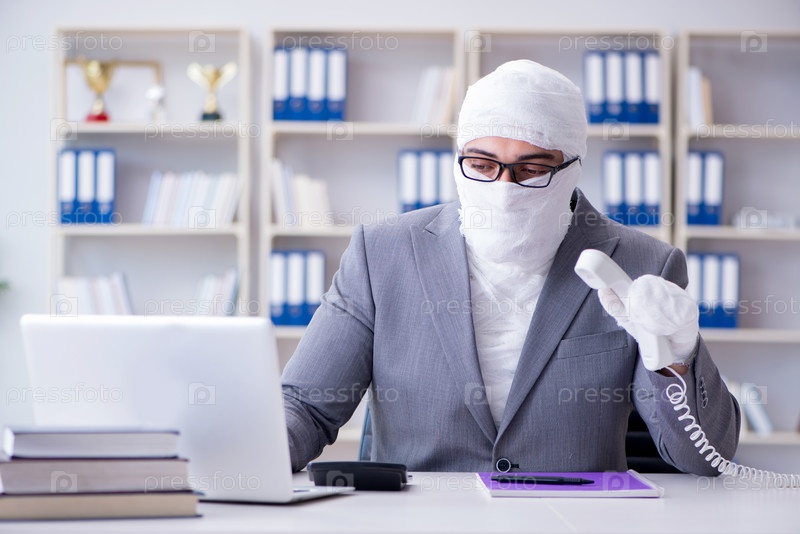 Завязанный бизнесмен-работник, работающий в офисе и занимающийся бумажной работой