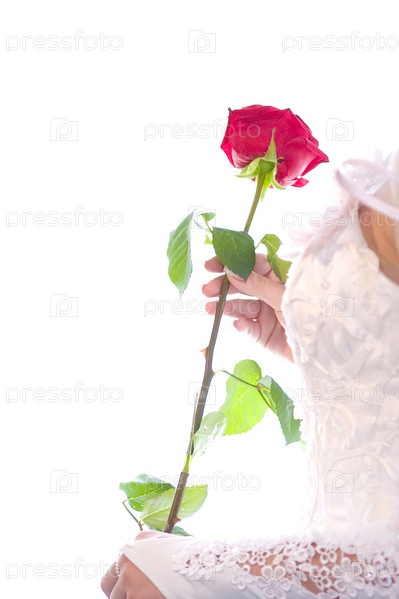 Женские руки держат красную розу на белом фоне