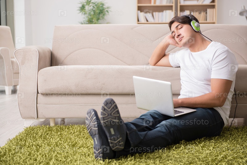 Фрилансер, работающий дома и слушающий музыку