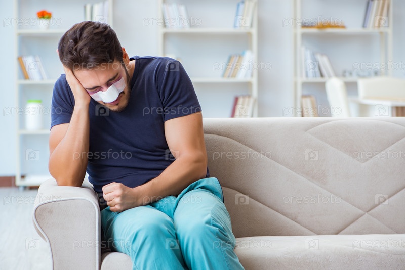 Молодой человек, восстанавливающийся дома после пластической операции на носу