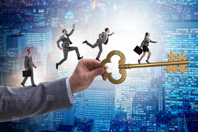 Бизнесмены, преследующие друг друга в направлении ключа к успеху
