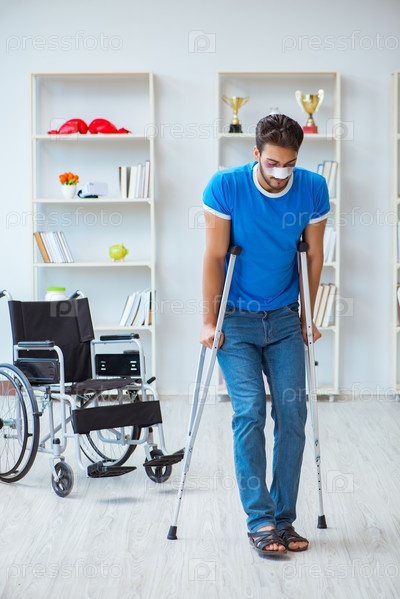 Молодой человек, восстанавливающийся после операции дома с костылями и рукой