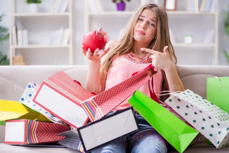 Молодая женщина с сумками для покупок в помещении дома на диване