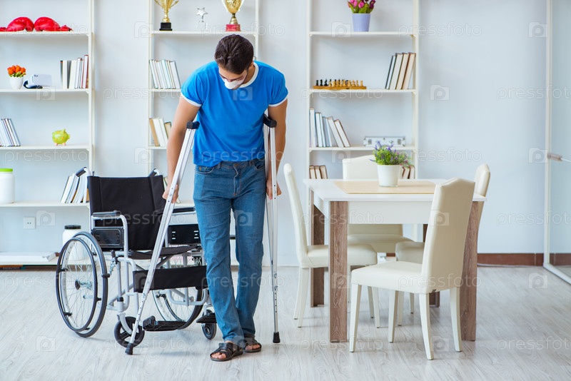 Молодой человек, восстанавливающийся после операции дома с костылями и рукой