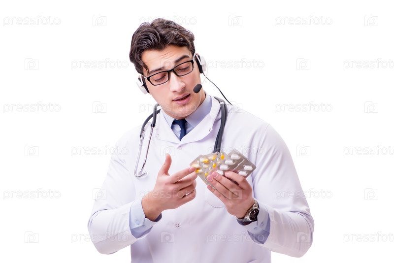 Молодой врач с гарнитурой для телефона изолирован на белом