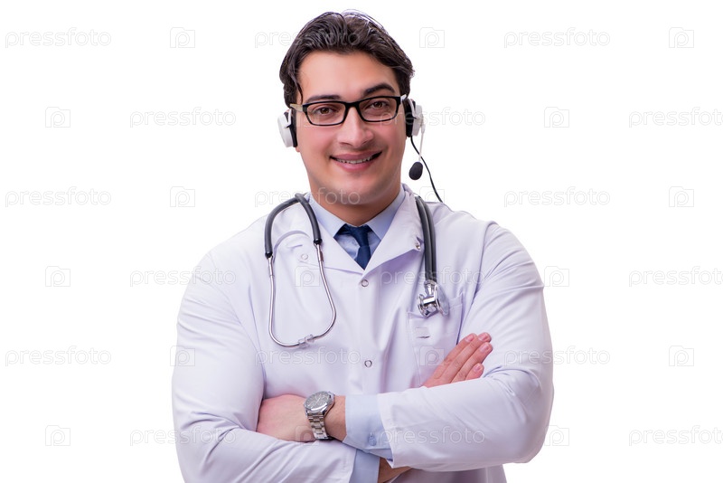 Молодой врач с гарнитурой для телефона изолирован на белом