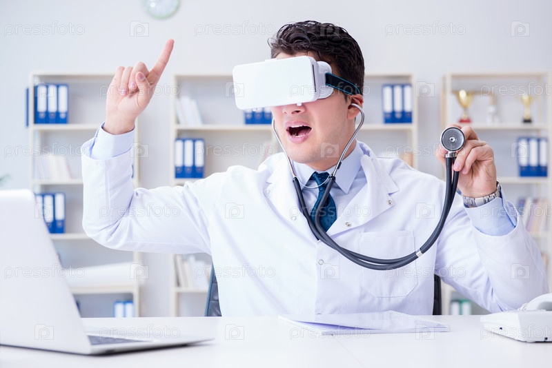 Молодой врач с VR гарнитурой виртуальной реальности работает в офисе