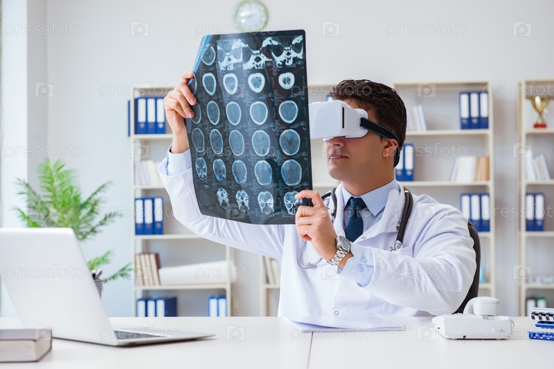 Молодой врач смотрит на МРТ-сканирование через очки VR