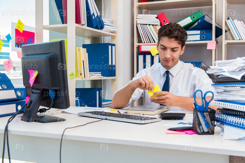 Бизнесмен, работающий в офисе с кучами книг и бумаг