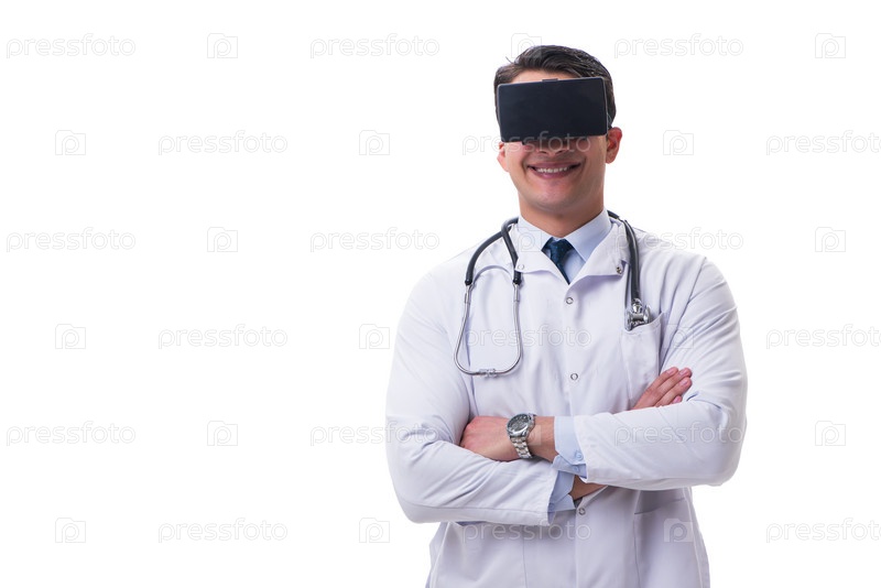 Доктор носит очки 3D виртуальной реальности на белом