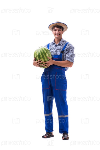Молодой фермер с арбузом, изолированным на белом