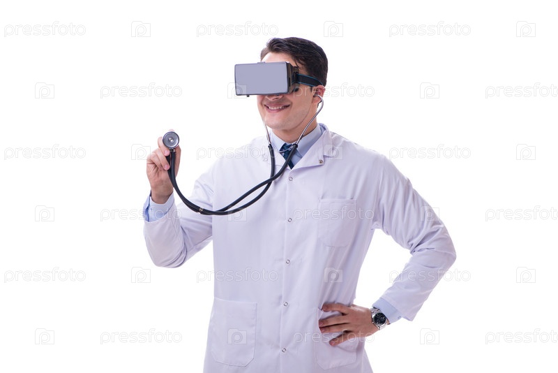 Доктор, носящий VR гарнитуру виртуальной реальности изолирован на белом ба