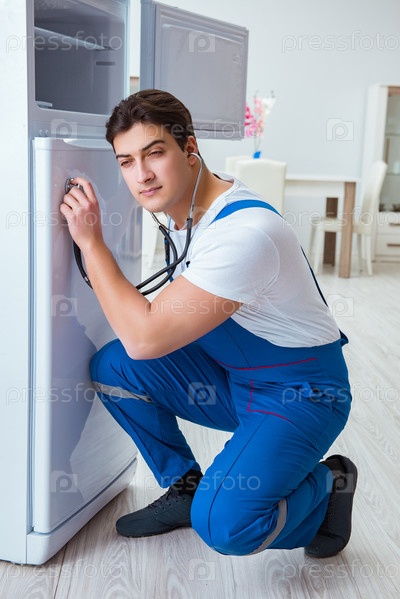 Ремонтник подрядчик ремонтирующий холодильник в концепции DIY