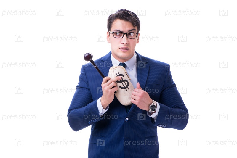 Адвокат с молотком и сумкой денег деньги плохие изолированы на белом