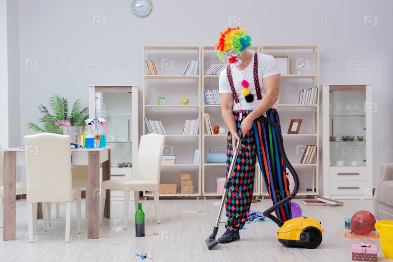 Забавный клоун убирает дома