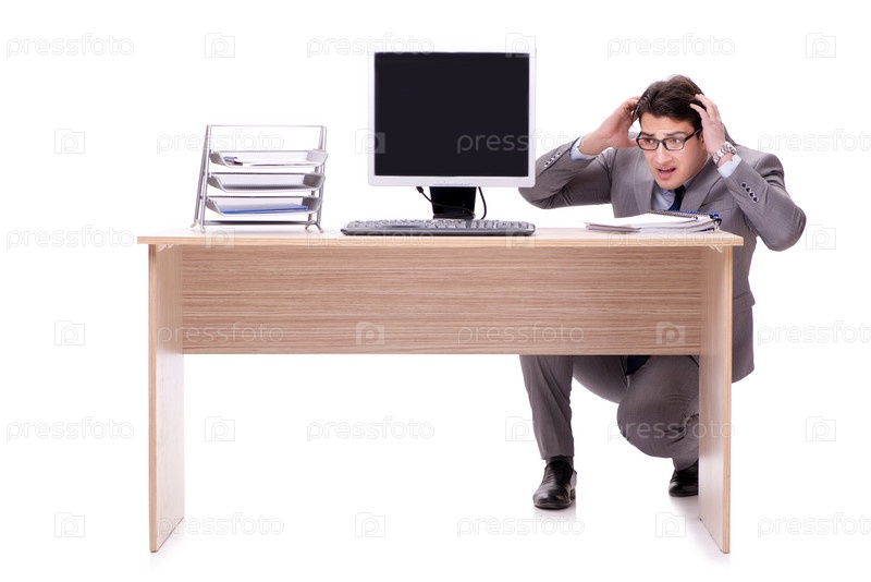 Бизнесмен прячется в офисе, изолированном на белом