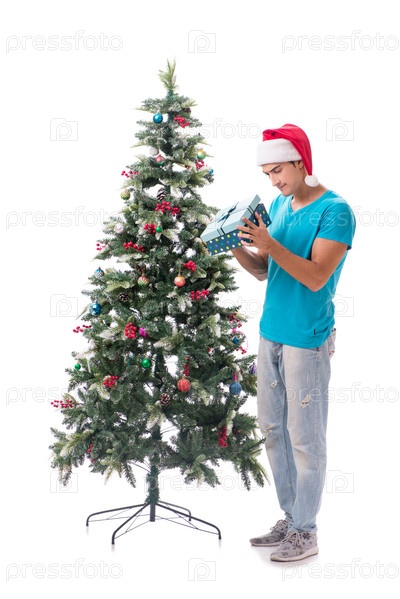 Молодой человек украшает рождественскую елку, изолированную на белом