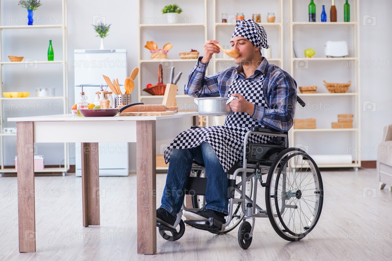 Инвалид готовит суп на кухне