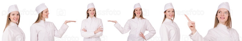 Молодая женщина-врач изолирована на белом