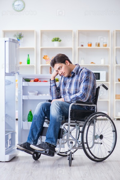 Молодой инвалид, раненый мужчина открывает дверь холодильника