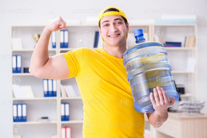 Мужчина доставляет бутылку с водой в офис