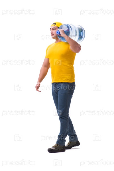 Мужчина доставляет бутылку с водой, изолированную на белом