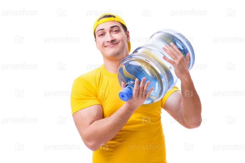 Мужчина доставляет бутылку с водой, изолированную на белом