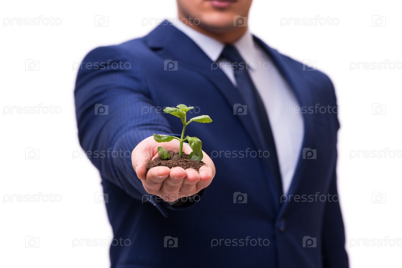 Бизнесмен держит зеленые побеги, изолированные на белом