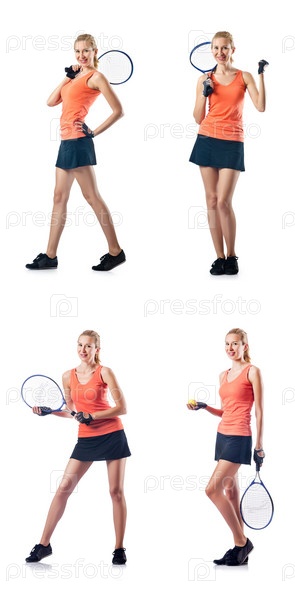 Молодая женщина, играющая в теннис изолирована на белом