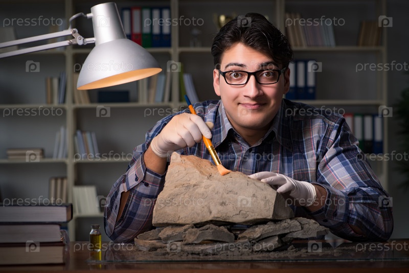 Археолог, работающий поздно ночью в офисе