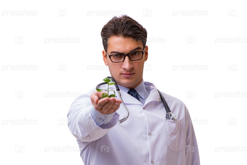 Ученый с зеленым саженцем в стекле, изолированном на белом