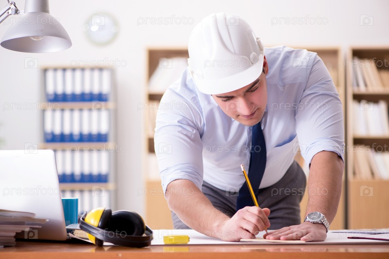Инженер-начальник работает над чертежами в офисе