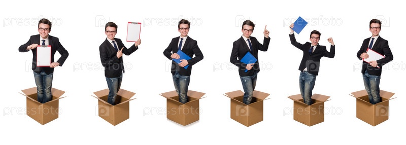 Забавный человек с коробками, изолированными на белом