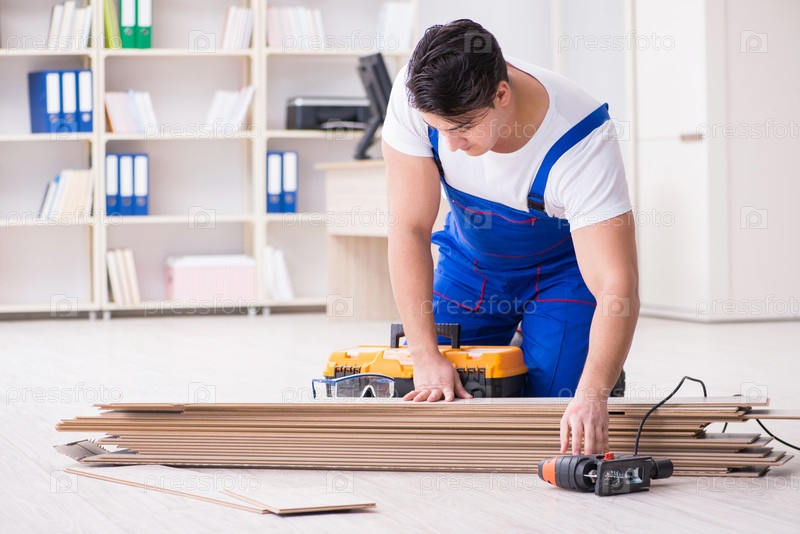 Молодой рабочий работает на напольной ламинированной плитке