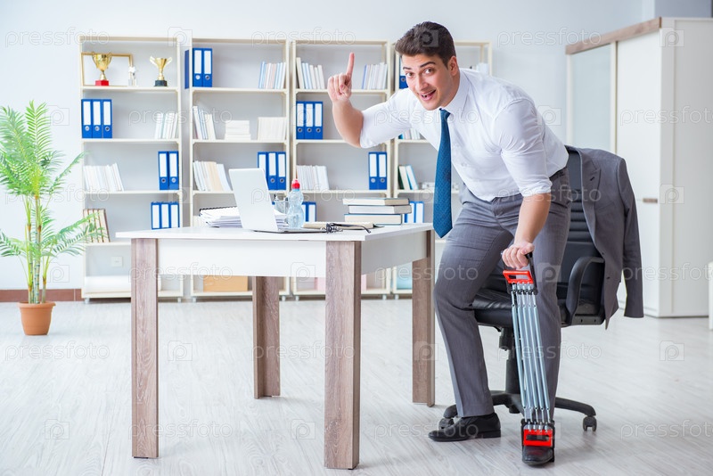 Молодой бизнесмен тренируется с эластичным экспандером в офисе