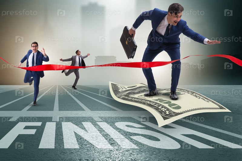 Бизнесмен летит на долларовой банкноте к финишу