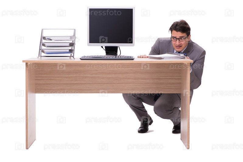 Бизнесмен прячется в офисе, изолированном на белом