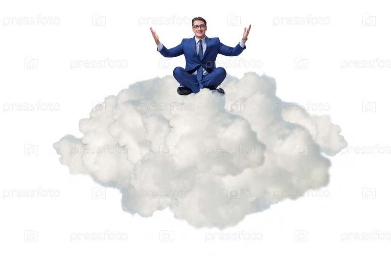 Бизнесмен, сидящий на облаке изолированный от белого