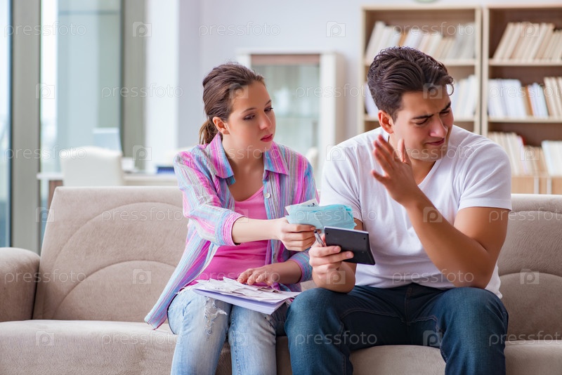 Молодая семья обсуждает семейные финансы