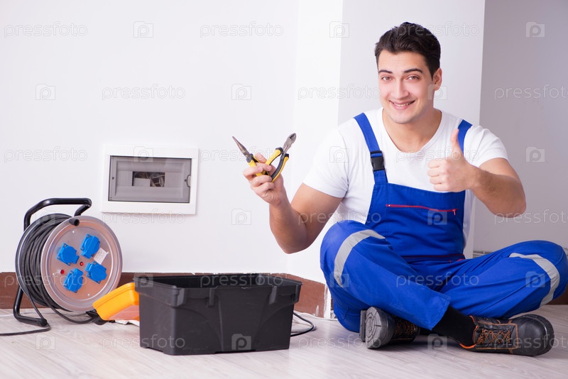 Молодой электрик работает на розетке дома