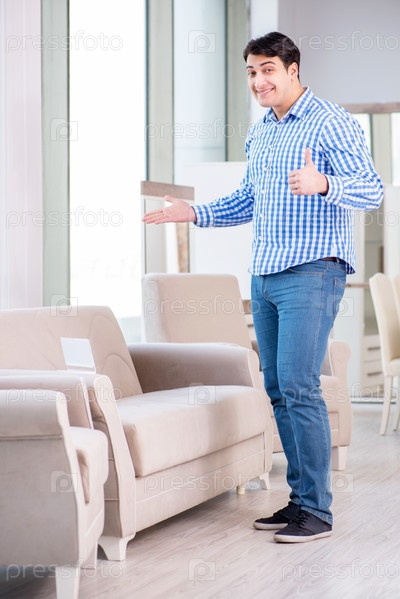 Молодой человек делает покупки в мебельном магазине