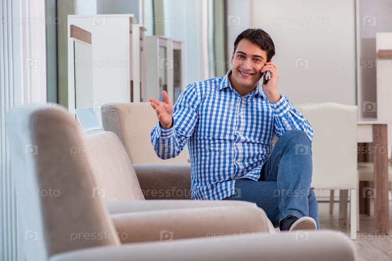 Молодой человек делает покупки в мебельном магазине