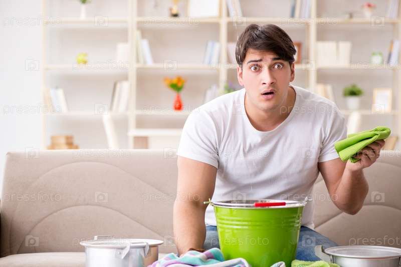 Мужчина дома, имеющий дело с соседней утечкой воды