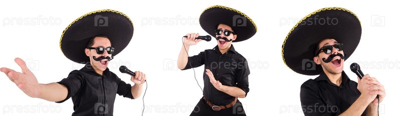 Забавный мужчина в мексиканской шляпе сомбреро, изолированной на белом