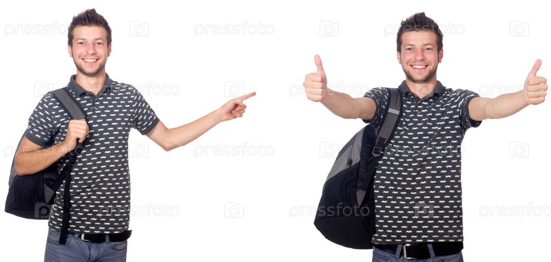 Коллаж студента с рюкзаком на белом