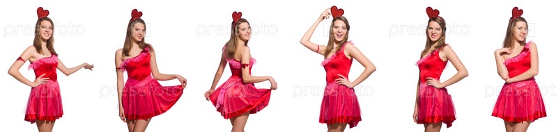 Девушка в красивом розовом платье изолирована на белом