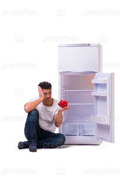 Голодный человек ищет деньги, чтобы заполнить холодильник