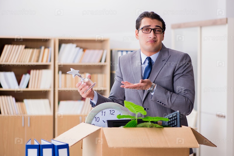 Человек, переезжающий офис с коробкой и его вещами