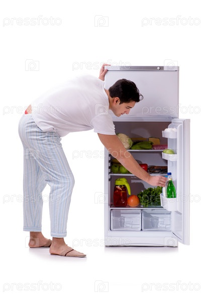 Человек рядом с холодильником, полным еды