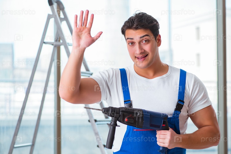 Молодой рабочий с ручной дрелью